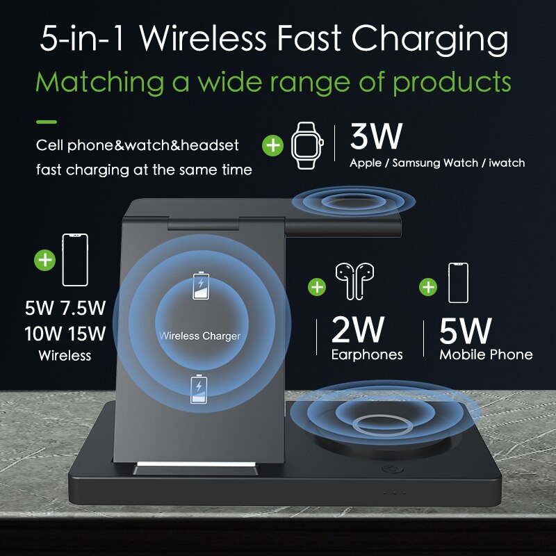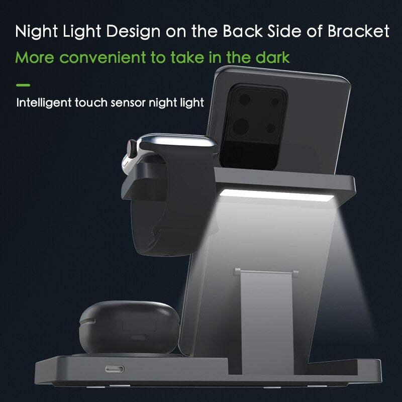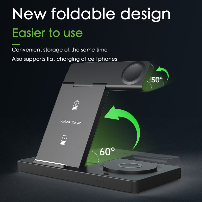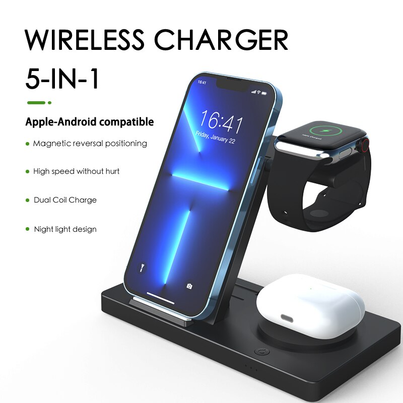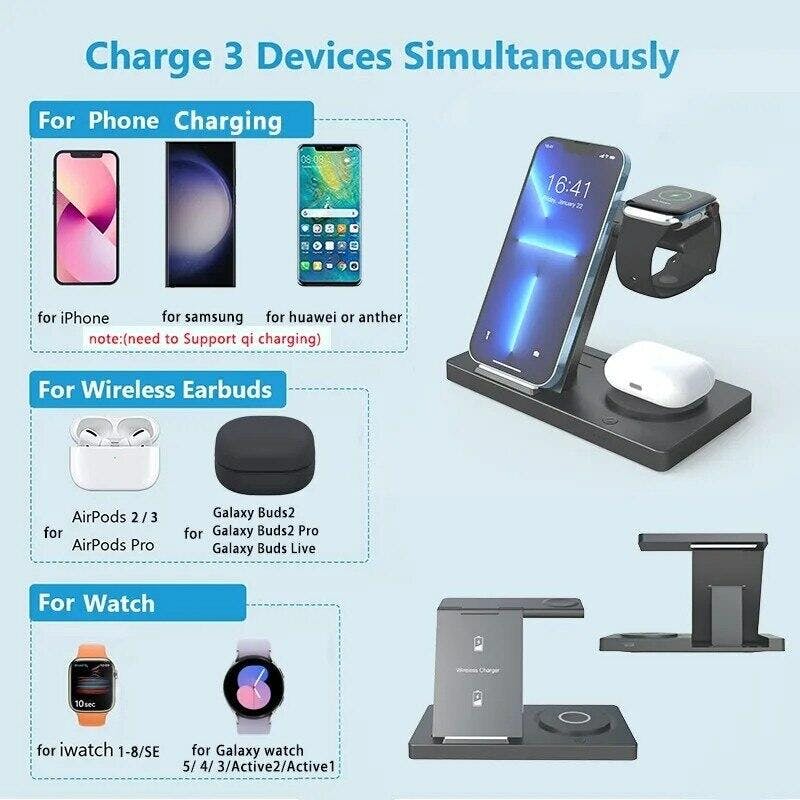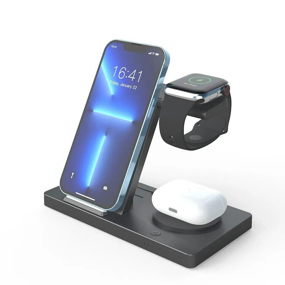 This 3-in-1 wireless charging magnetic dock is perfect for charging your iPhone, iWatch, and Airpods with one single device. It features a strong magnetic connection to make sure all charging cables stay in place and efficient wireless charging capabilities for a quick recharge. Get all your products charged at once with this convenient device.
